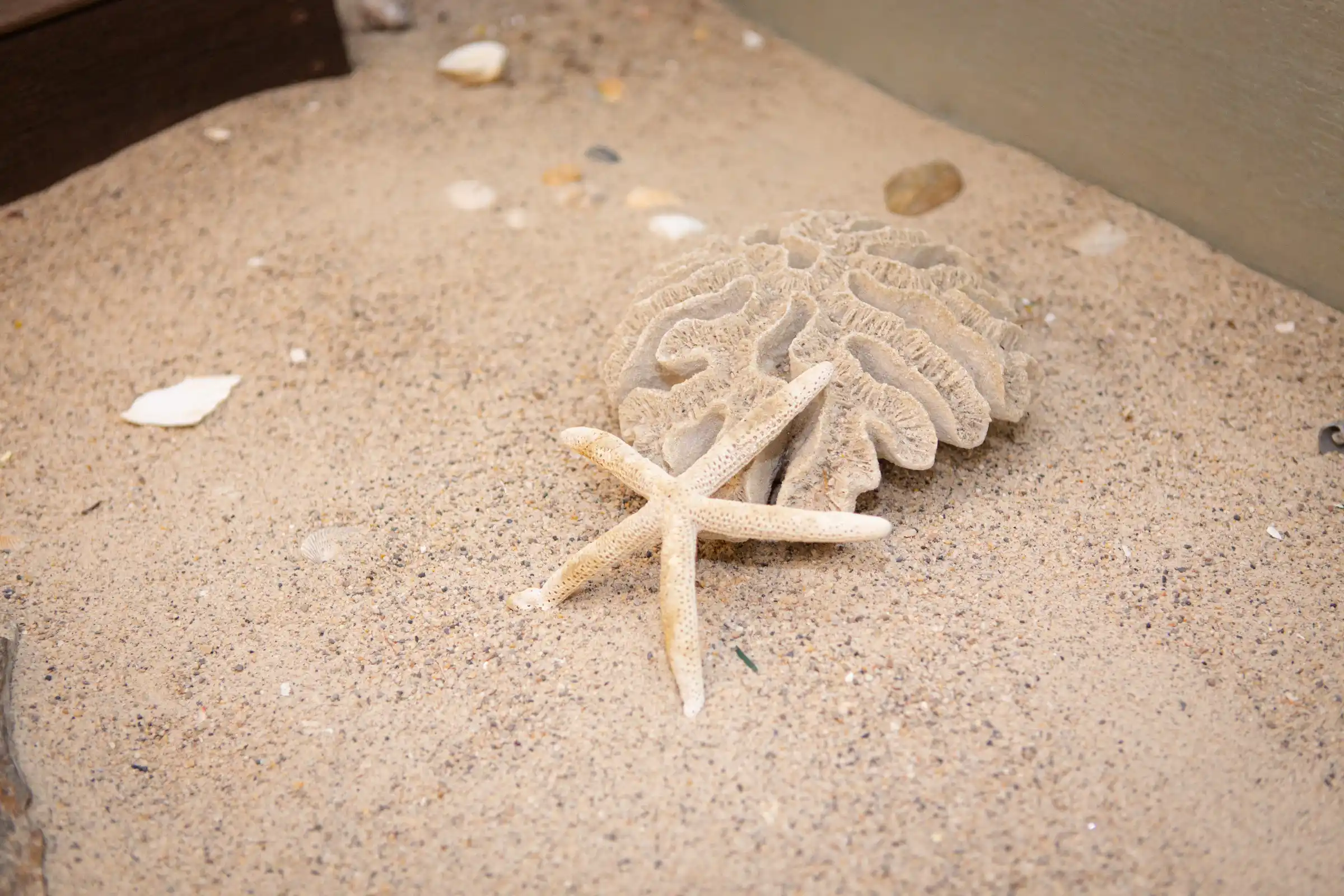 Indulge in a luxurious tropical escape within our exquisite Tahiti Room. As you enter, you'll be greeted by real sand underfoot, instantly whisking you away to the islands. The room's stunning focal point is a large fish tank impressively set directly into the floor.