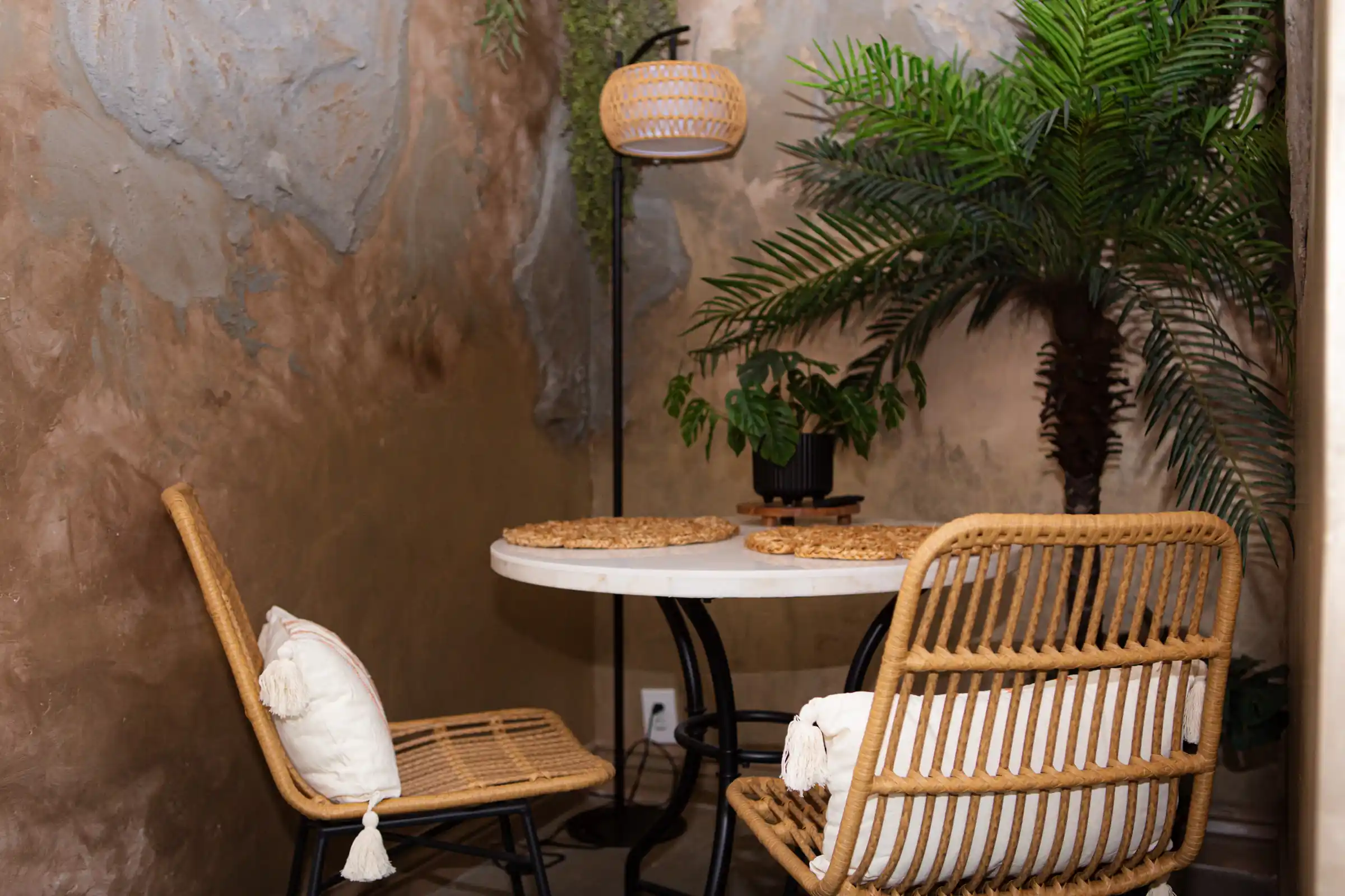 Step into your luxurious private suite, a modern tropical paradise. The exotic sand pathway and tranquil jungle setting melt stress away. The romantic King bed, fireplace, and adjustable mood lighting create an intimate ambiance. Indulge in serenity with a comfortable claw-foot tub for two, set in nature. For a quiet escape, you will find a hammock to truly unwind. The Cancun Suite is an exotic, modern paradise for an unforgettable stay.